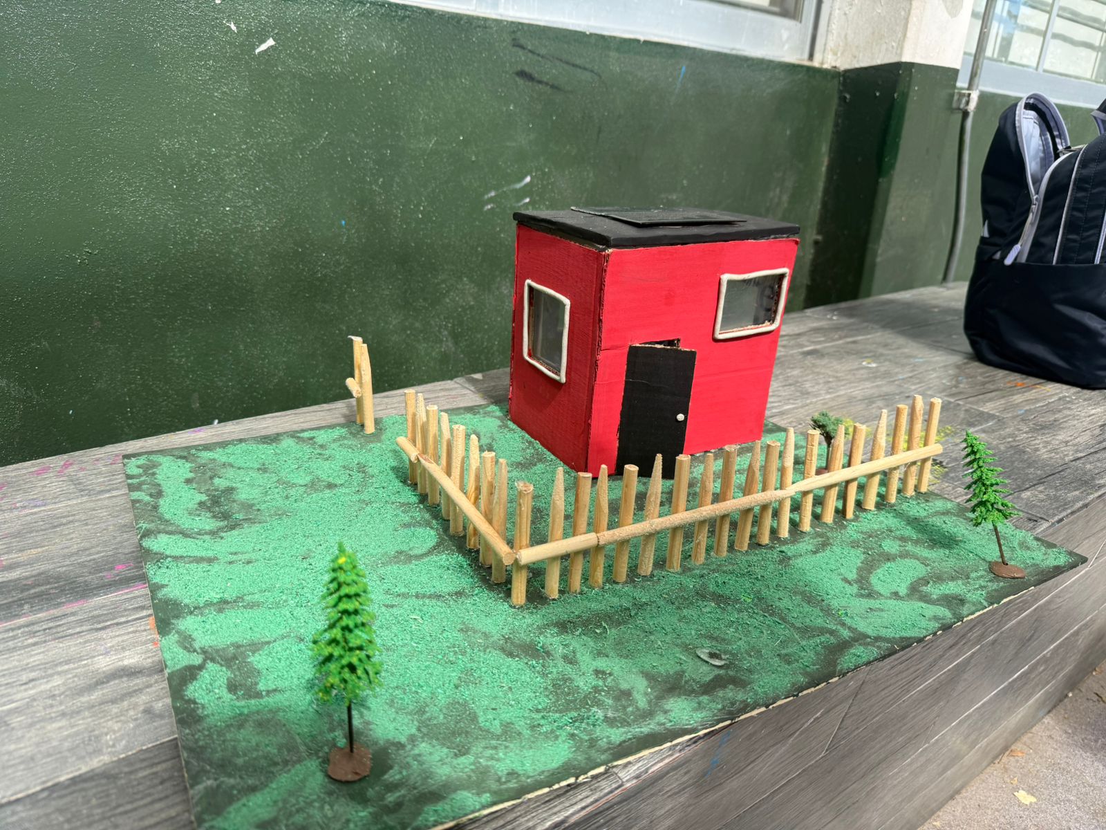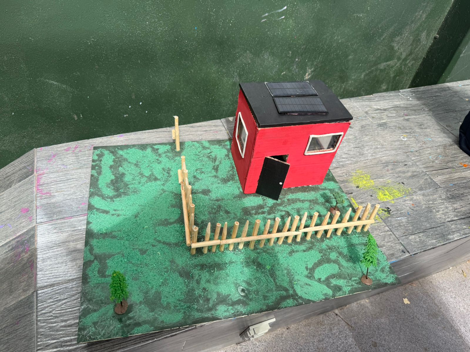 La maqueta representa una casa ecológica equipada con paneles solares funcionales, construida con cartón, madera, pintura, pasto artificial y LEDs, que simulan el aprovechamiento de la energía del sol para iluminar el hogar.